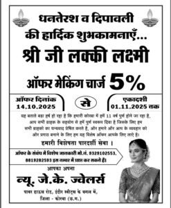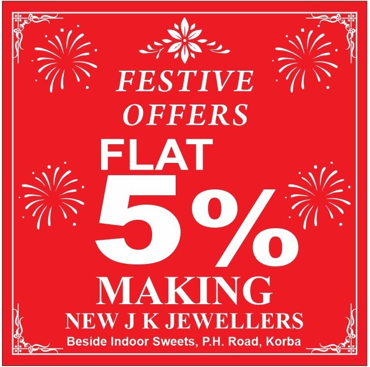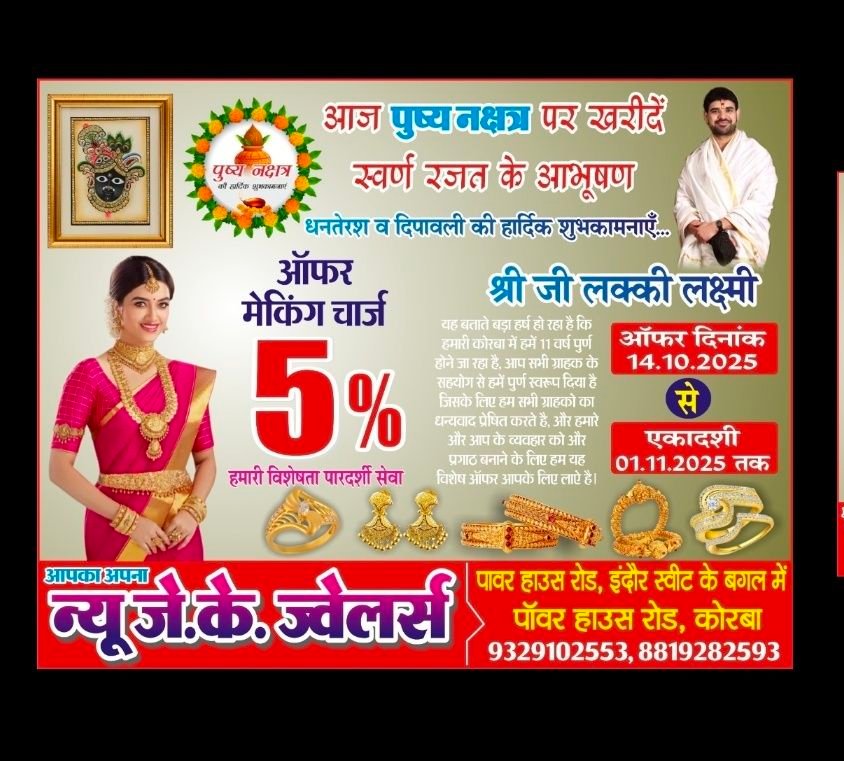 The Bharat time’s 24 news कोरबा:-सोने की शुद्धता और गारंटी के साथ न्यू जेके ज्वैलर्स के इंदौर स्वीट्स के बगल अपने ग्राहकों के लिए लाया है श्री जी लक्की लक्ष्मी ऑफर मेकिंग चार्ज 5% के हिसाब से सबसे कम मेकिंग चार्ज दर निर्धारित किए हैं जिससे ग्राहकों को कम मेकिंग चार्ज की दर पर सोना उपलब्ध हो सके !